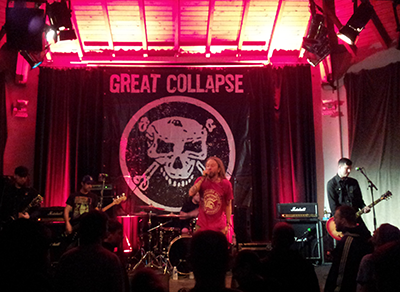 Great Collapse aus den USA setzen sich aus berühmten Superpunks zusammen. Sänger Thomas Barnett (Strike Anywhere), die Gitarristen Chris Chasse (Rise against, Nations on fire) und Tom Arnott (At risk), Bassist Joe Saucedo (Set your goals) und Schlagzeuger Todd Hennig (Nations on fire, Death by stereo). Der Unterschied zu den beiden Bands davor ist richtig krass. Hier stimmt nicht nur der Sound, sondern auch der musikalische Flow und nicht zuletzt die Inhalte. Das ist schon Headliner-Niveau für ein mittelgroßes Festival, das hier vor ein paar Zuschauern gezeigt wird. Schade, dass so wenig los war und diese Tatsache merkt man den etwas enttäuscht wirkenden Musikern an. |