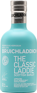 Bruichladdich wird in auffälligen, matthellblauen 0,7ern ausgeliefert. Der ungetorfte Single Malt ist sehr ausgewogen und etwas scharf. Der "Classic Laddie Scottish Barley" zählt zu meinen Lieblings-Whiskys. Mit etwas Glück ist das weitverbreitete Getränk für ca. 30 € zu erwerben.