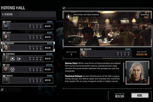 Auf der Suche nach neuen Piloten - In der Kneipe!Was eine richtig gute Weltraumbar ausmacht? Piloten zocken und ziehen dort einen ab! Von den Damen und Herren in den Etablissements sind die wenigsten sauber. Manche sind in elf Sternensystemen zum Tode verurteilt. Anhand der Werte "Schütze", "Pilot", "Mut" und "Taktik" lässt sich einschätzen, wer denn nun dein Herzblatt sein soll. Gewisse Fertigkeiten können sich später in besonderen Ereignissen als nützlich erweisen. Spezialisierungen auf einen Schwerpunkt erlauben später beispielsweise Scharfschützen oder super-geschickte Piloten.