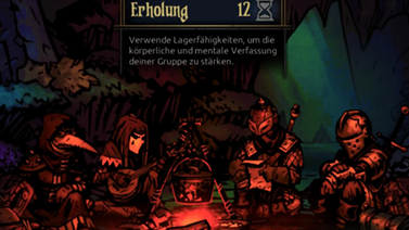 | Zum Glück hat jeder nicht nur bis zu 4 (von maximal 6) Kampffähigkeiten, sondern auch besondere Talente, die bei der Rast am Lagerfeuer eingesetzt werden können. Der Kreuzfahrer kann etwa eine ermutigende Rede halten, die Pestdoktorin mit Blutegeln heilen und der Narr mit seiner Laute ein Lied anstimmen, das die Moral hebt. | ||||||