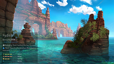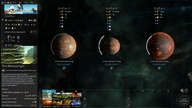 | Planeten und Monde sind äußerst unterschiedlich, aber nicht besonders wissenschaftlich korrekt, was eigentlich fürs ganze Spiel gilt. Von Lava über giftig bis zu Monsun-Planet findet man alles. Auch stellare Phänomene wie Neutronen-Stern, Nebel, Protostern oder Schwarze Löcher entdeckt man. Einzigartige Ressourcen, wie Antimaterie, lassen sich einsammeln und atmosphärische Eigenheiten, wie psycho-aktive Luft oder Kepler-Syndrom beeinträchtigen die Siedler. Das Besiedeln fällt je nach Spezies unterschiedlich leicht. Während Menschen ein Siedler-Schiff schicken, welches einen Außenposten errichtet, gelingt dem ungefallenen Baumvolk Wurzeln zu schlagen, sobald sie ihre Ranken aussgestreckt haben. Auch der Grad der Terraformung von widrigen Orten liegt in der Hand des Spielers. | |||