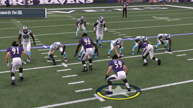 | Die Defensivformation ist simpler zu handhaben, schließlich ist es ihr Ziel Bewegungen des Gegners schnell zu unterbinden und Würfe abzufangen. Es bietet sich an mit [Kreis] oder [B] -Taste einen guten Mann auszuwählen, (z.B. Defense Tackle Kewann Short, siehe Bild oben) den man zu einer besonderen Aktion bewegt, etwa den gegnerischen Spielmacher in die eigene Endzone zu drängen. Die Anderen werden vom Spiel gesteuert, können jedoch jederzeit übernommen werden. Der Kicker des Spezialteams unternimmt einen Geschicklichkeitstest ähnlich des Abschlags bei "Rory-McIlroy-Golf" und versucht den Ball durch die Stangen zu bekommen. Das verteidigende Team kann diese zu blocken versuchen. Dreist für 2 Punkte die Verteidigung auszutricksen und eine erneuten Lauf in die Endzone zu versuchen ist ebenso drin. Punts (Befreiungsschüsse) funktionieren ähnlich. | |||||