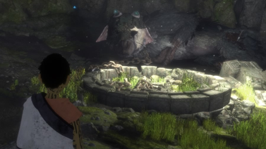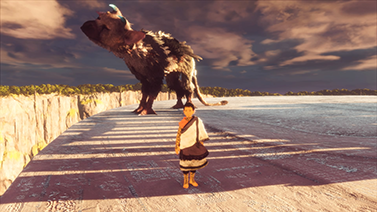 | Ohne viel Erklärung, Inventar oder gar Handbuch geht's los. Aus der Höhle heraus kommt man nur mit Hilfe des Wesens, so viel ist klar. Gesteuert wird aber nur der Junge. Dieser kann springen, etwas aufheben, klettern, Trico streicheln, Hebel ziehen und etwas anrempeln. Das war's. Trico verhält sich überraschend intelligent, kommt seinerseits an manchen Stellen aufgrund seiner Größe aber nicht weiter. So klappt die Reise nur, wenn sich beide helfen. Erfreulicherweise gestattet das Tier dem Jungen auf seinem Rücken Platz zu nehmen und ihm dezente Hinweise auf die Richtung zu geben, in die es weitergehen könnte (mit [R1]). | ||