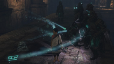 | Was hat es mit den gepanzerten Kriegern auf sich? Steckt da überhaupt jemand in der Rüstung? Jedenfalls versuchen die Gestalten den Jungen zu fangen und in Schreine zu verfrachten. Zum Glück kann man ihnen entkommen, sich an ihren Rücken festklammern, sie umrempeln oder darauf hoffen, dass Trico wütend auf sie eindrischt. | ||
