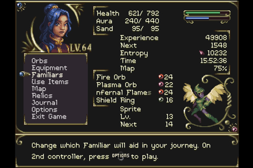Die Kugeln hauen voll reinTimespinner ist ein traditionelles Jump'n'Run mit Rollenspiel-Elementen. So wird Lunais immer stärker, sammelt bessere Zauberkugeln, Ausrüstung, Spezialattacken und lernt neue Fähigkeiten. Auf der Erkundungsreise begegnet sie dazu Begleitern, etwa einem kleinen Drachen oder einem Greif. Diese sind nicht unnützlich, da sie aus der Luft angreifen, Gegner ablenken und ebenfalls schlagkräftiger werden. Übrigens kann ein zweiter Spieler den Begleiter steuern!